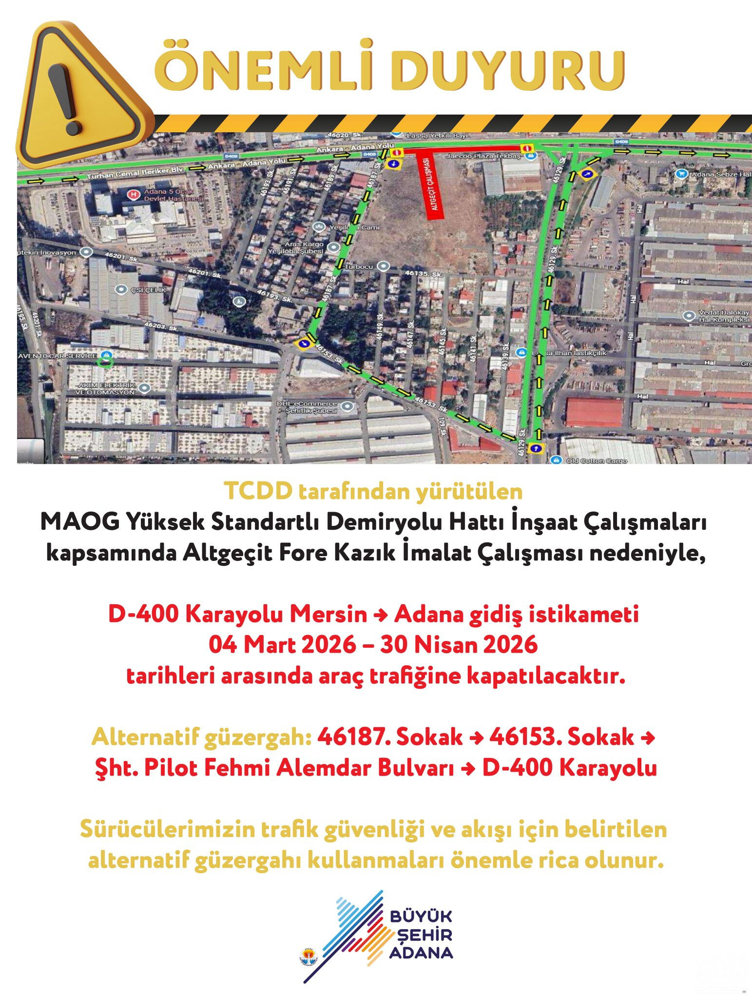 TCDD tarafından sürdürülen MAOG Yüksek Standartlı Demiryolu Hattı İnşaat Çalışmaları çerçevesinde yapılacak Altgeçit Fore Kazık İmalat Çalışması nedeniyle;