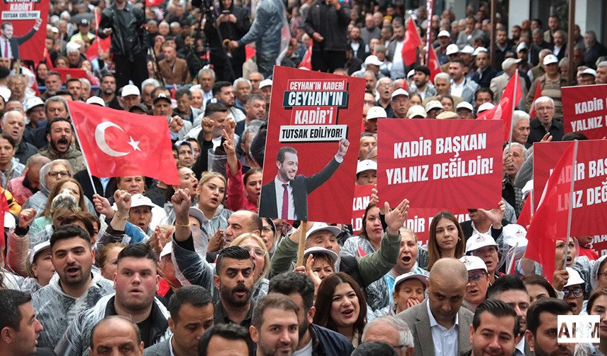 Miting alanı, “Ceyhan tarihinin en yüksek oyu ile 2 defa seçilen başkanı”, “Kaderimiz bir, Kadir’imiz bir” ve “Ceyhan 300 gündür adaleti, Kadir’i istiyor” yazılı pankartlarla donatıldı.