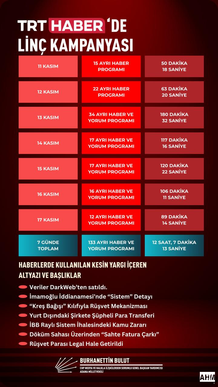 İBB’ye yönelik 19 Mart siyasi operasyonunun hemen ardından, kamu yayıncısı olan TRT Haber’de tarafsızlık ilkesi açıkça yok sayılmış, soruşturmanın gizliliği alenen ihlal edilmiş, daha yargı süreci başlamadan insanlar suçlu ilan edilmiştir. Darbenin medya kolu olarak hareket eden TRT’nin öncülüğünde yandaş medya kanalları organize bir linç kampanyası yürütmekte, RTÜK ise yapılan şikayetleri sümen altı ederek bu hukuk ve etik katliamının ortağı haline gelmektedir. TRT yöneticileri Beştepe’ye sırtını dayayıp Oran Sitesi’nden, Söğütözü’ne, demokrasiye, adalete, hukuka ateş ediyorlar. İddianame açıklandıktan sonraki 11-17 Kasım tarihleri arasında toplam 12 saat 7 dakika 13 saniye, tek yanlı ve masumiyet karinesini yok sayan tek yanlı kara propoganda yapıldı. Karalama kampanyasının üssü TRT Haber’de Birinci Sayfa ve Odak Gündem programları başta olmak üzere 133 haber ve yorum programında kişileri peşinen suçlu ilan eden ifadelere ve alt yazılara yer verildi. Ekranlara çıkarılan sözde yorumcular, masumiyet karinesini ayaklar altına alarak seçilmiş belediye başkanlarımızı peşinen suçlu ilan etmekte, çete ve mafya gibi ağır ithamlarla hedef göstermekte; şahsiyetlerine, ailelerine, onurlarına pervasızca saldırmaktadır. Bu, sadece kişi haklarına değil, demokrasiye, hukukun üstünlüğüne ve halk iradesine dönük bir operasyondur.