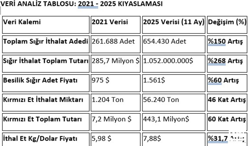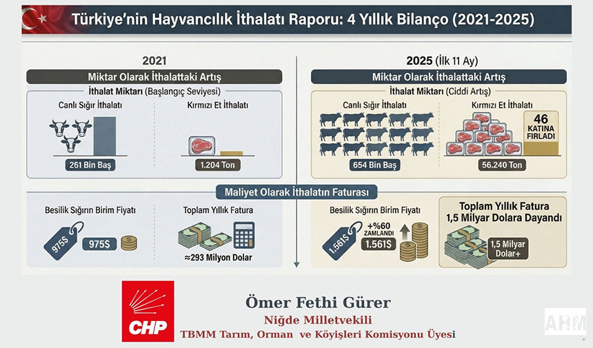İthalatın sadece fiyatı değil, miktar olarak da arttığını belirten CHP Niğde Milletvekili Ömer Fethi Gürer, 2021 yılında toplam 261.688 adet sığır ithal edilirken, 2025’in ilk 11 ayında bu sayı 654.430 adede ulaştı. Artış oranı yaklaşık %150. 2021’de sığır ithalatına 285,7 milyon dolar ödenirken, 2025’in ilk 11 ayında bu rakam 1 milyar 52 milyon dolara (1,05 Milyar $) çıktı. Toplam tutardaki artış %268 olarak hesaplandı.” Dedi.