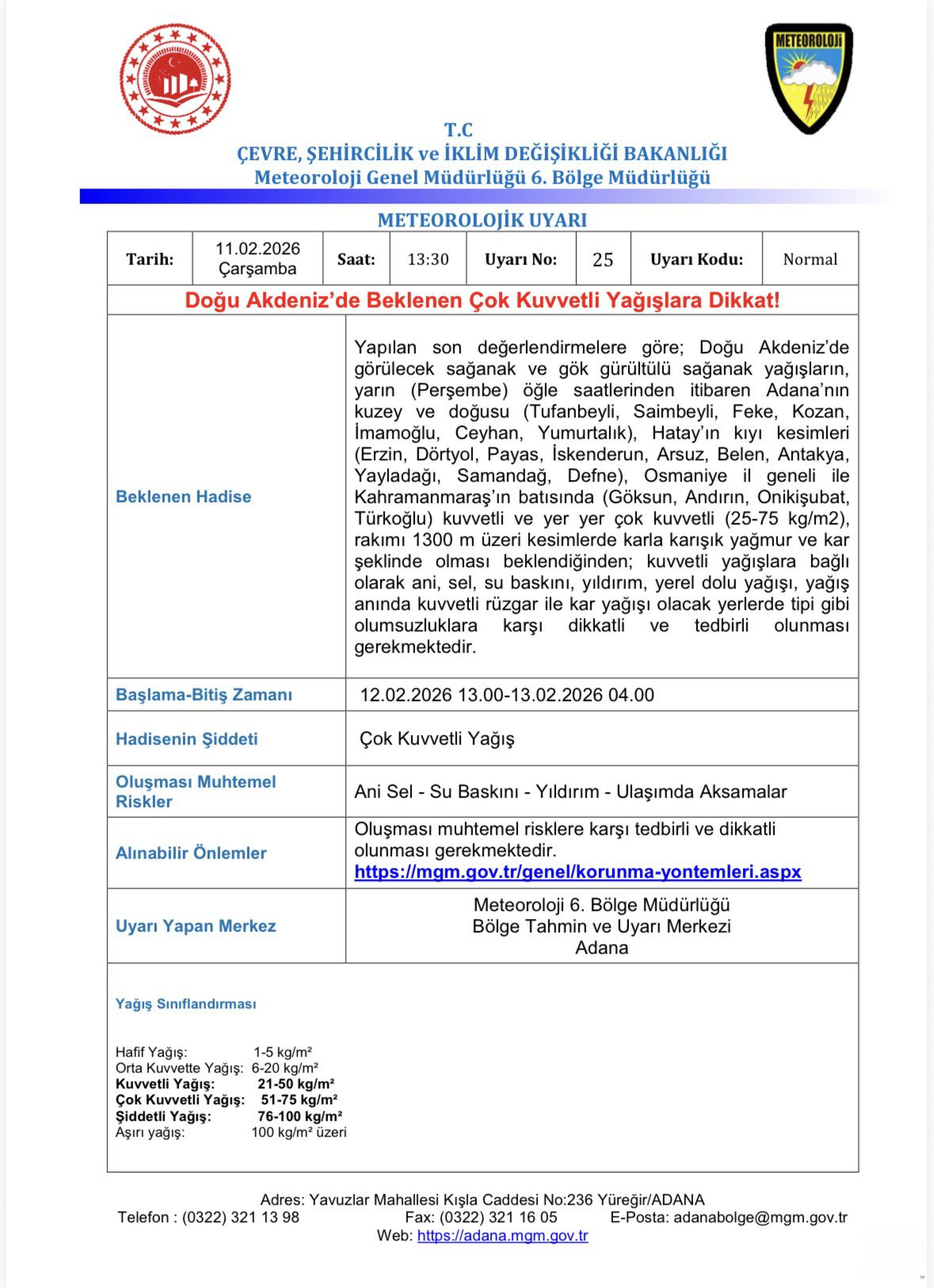 Uyarıya göre Adana’da özellikle Tufanbeyli, Saimbeyli, Feke, Kozan, İmamoğlu, Ceyhan ve Yumurtalık ilçelerinde yağışların kuvvetli ve yer yer çok kuvvetli (25–75 kg/m²) olacağı tahmin ediliyor.
