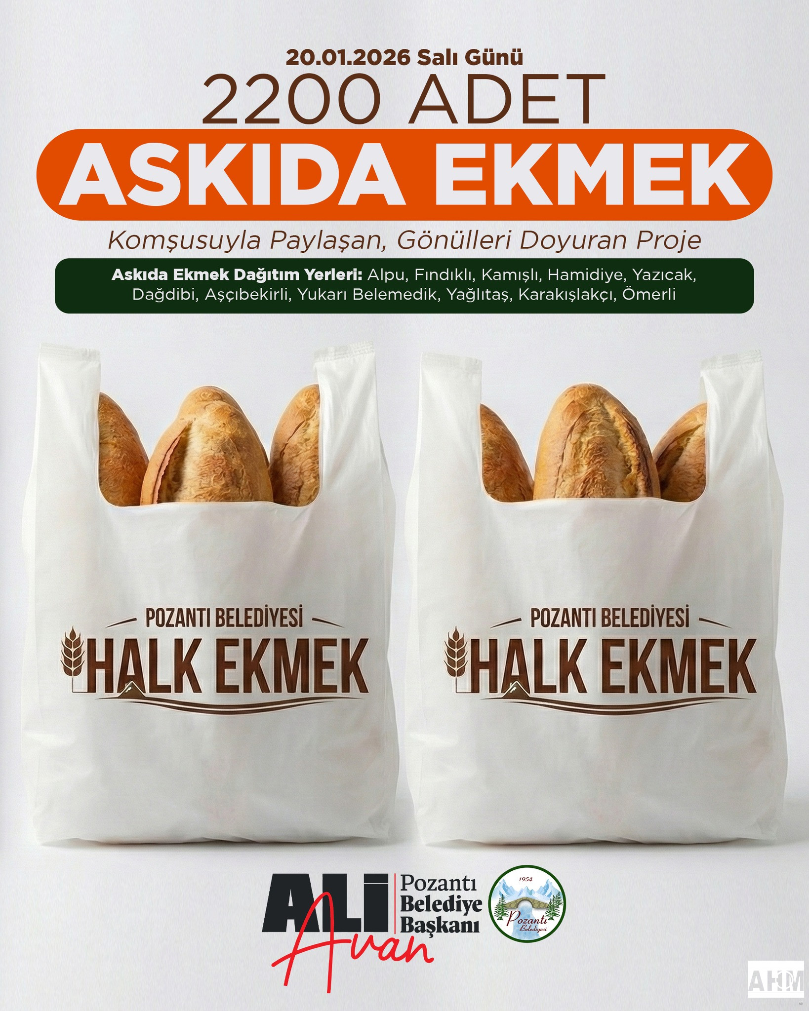 Bu çerçevede 2 bin 200 adet askıda ekmek, 20 Ocak 2026 Salı günü Pozantı’nın kırsal mahallelerinde vatandaşlara ücretsiz olarak ulaştırılacak.