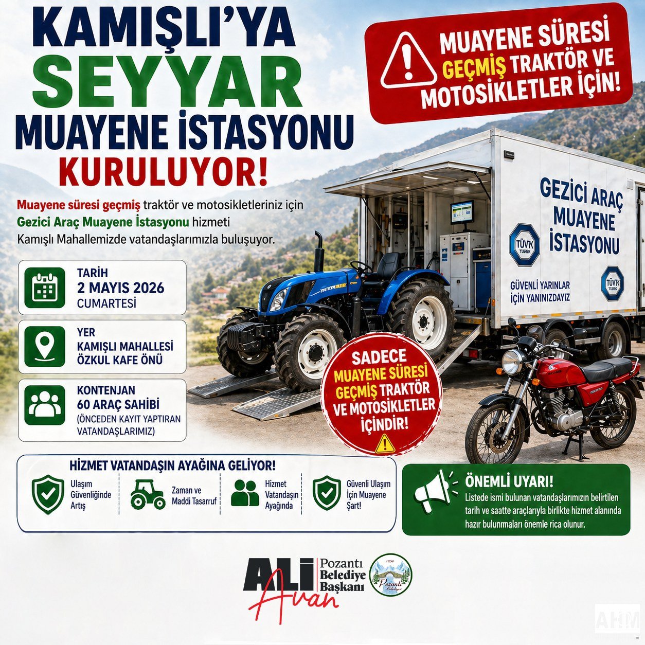 Başkan Avan, uygulama kapsamında traktör ve motosiklet sahibi, önceden kayıt yaptıran 60 vatandaşın araç muayenelerini Özkul Kafe önünde kolaylıkla yaptırabileceğini belirtti. Vatandaşların kilometrelerce yol gitmeden, zaman ve maliyet kaybı yaşamadan hizmet alabileceğini ifade etti.