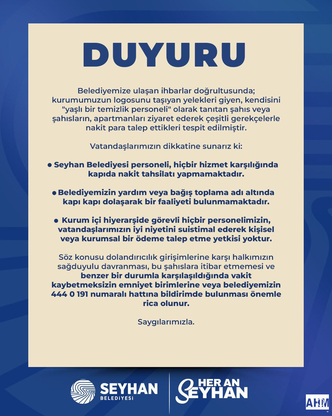 Seyhan Belediyesi personeli, hiçbir hizmet karşılığında kapıda nakit tahsilatı yapmamaktadır.