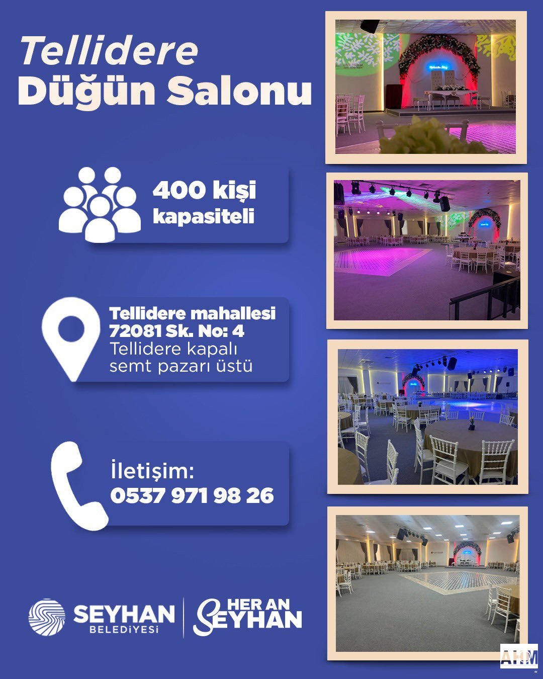 Seyhan Belediyesi tarafından hizmete sunulan Tellidere Düğün Salonu, düğün, nişan ve çeşitli organizasyonlar için ideal bir ortam sunuyor. Geniş kullanım alanı ve modern donanımıyla öne çıkan salon, vatandaşların en özel anlarını konforlu bir şekilde gerçekleştirmelerine olanak sağlıyor.