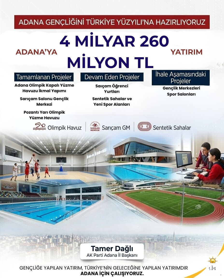 “Gençliğe yapılan yatırım, Türkiye’nin geleceğine yapılan yatırımdır. Cumhurbaşkanımız Sayın Recep Tayyip Erdoğan’ın liderliğinde Türkiye Yüzyılı’nı inşa ederken, güçlü şehirler ve donanımlı bir gençlik hedefiyle çalışıyoruz. 4 milyar 260 milyon TL’yi aşkın dev yatırım hamlesi, Adana’mızın yarınlarına duyduğumuz inancın en somut göstergesidir.”