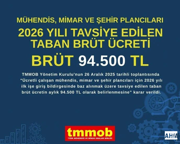 TMMOB Yönetim Kurulu kararıyla, 2026 yılı için aylık brüt taban ücret 94 bin 500 TL olarak belirlendi.
