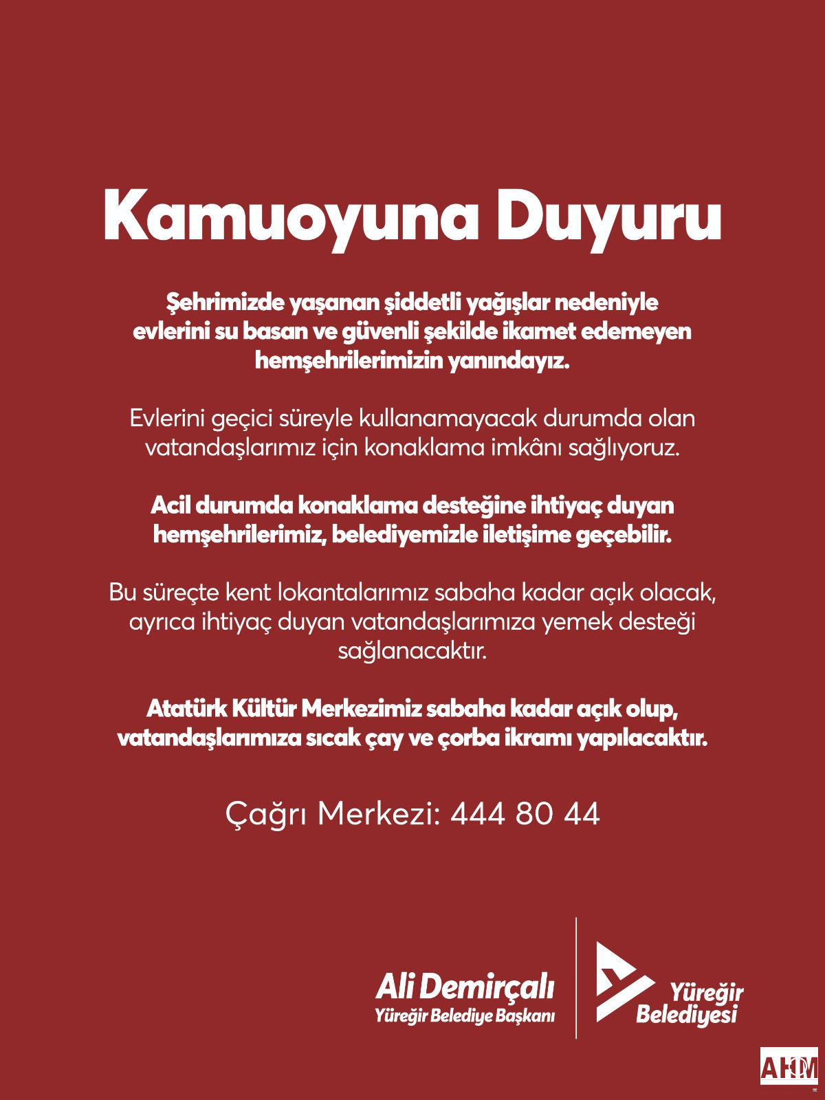 Belediye tarafından yapılan açıklamada, Atatürk Kültür Merkezi’nin sabaha kadar açık olacağı, burada vatandaşlara sıcak çay ve çorba ikramı yapılacağı kaydedildi.