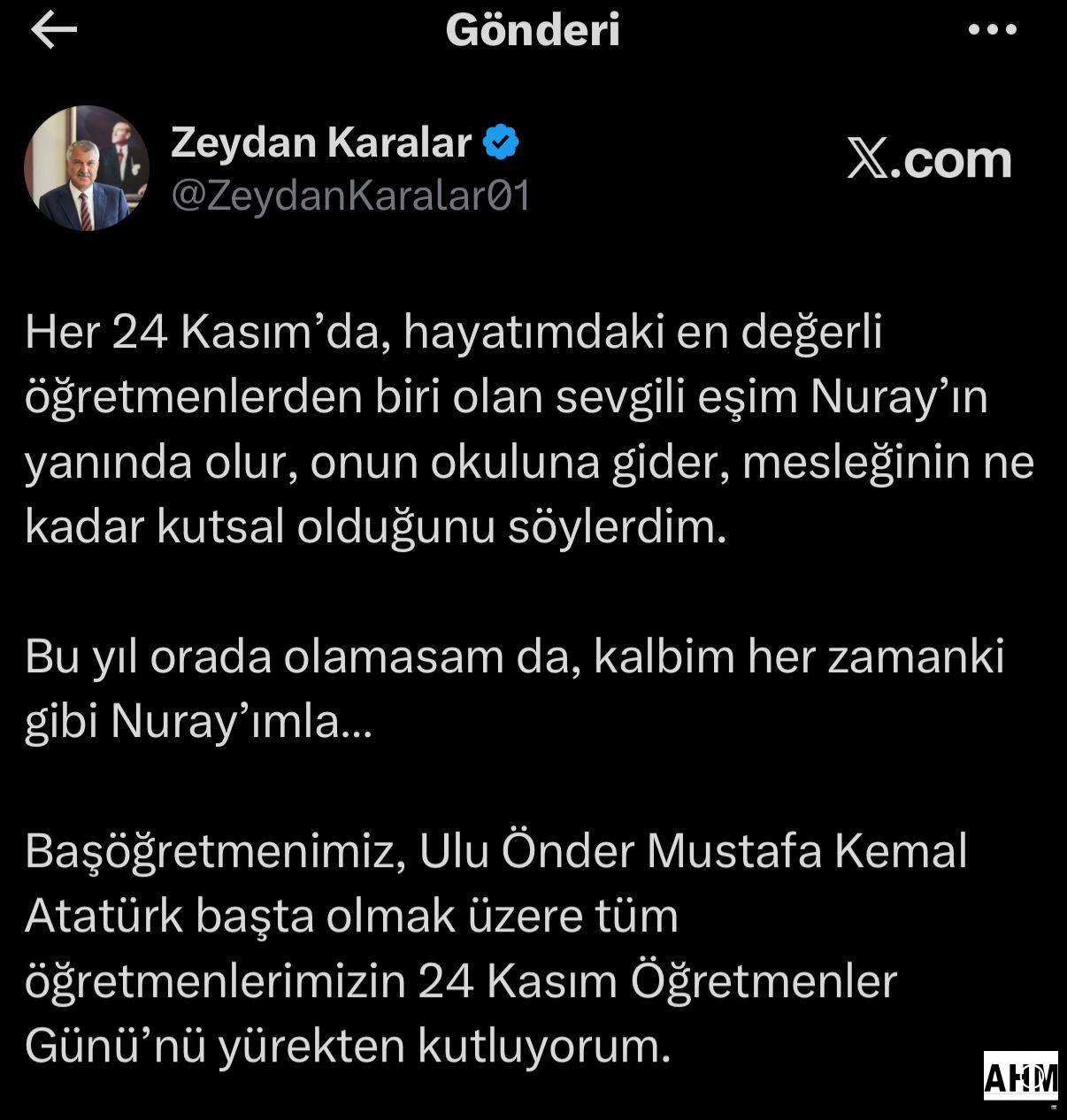 Zeydan Karalar, “Her 24 Kasım’da, hayatımdaki en değerli öğretmenlerden biri olan sevgili eşim Nuray’ın yanında olur, onun okuluna gider mesleğinin ne kadar kutsal olduğunu söylerdim. Bu yıl orada olamasam da, kalbim her zamanki gibi Nuray’ımla…